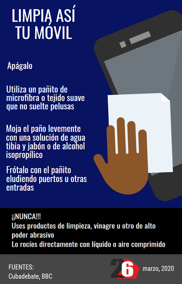 Las Tunas.- Junto al lavado de las manos, el teléfono móvil libre de la Covid-19 es otra medida importante, sugieren los expertos. Como promedio, el celular se manipula medio centenar de veces al día, precisamente, con las mismas manos con que hemos tocado esos lugares donde podrían estar las microgotas contentivas del virus, como pasamanos, picaportes, interiores de transportes colectivos o el dinero en efectivo.