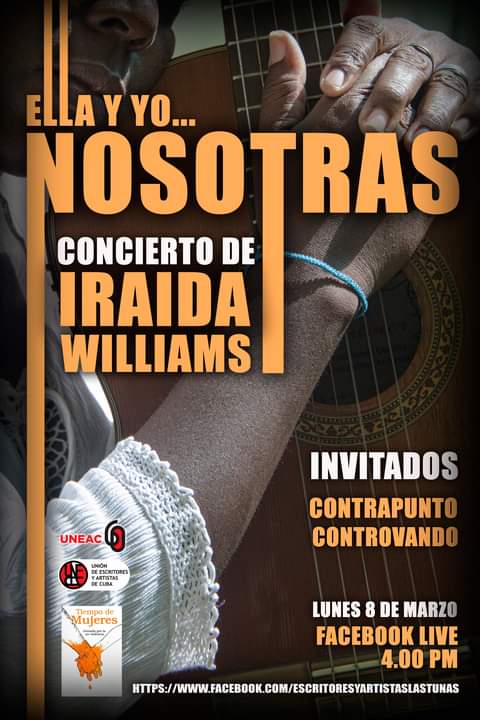 Mientras, la cantautora Iraida Williams, hoy a las 4:00 pm, protagonizará el concierto Ella y yo: nosotras, por Facebook Live, con el Proyecto Controvando y el grupo Contrapunto como invitados. Ella tradicionalmente, durante nueve calendarios, ha desarrollado citas de este tipo, en honor a la efeméride. Entre los aderezos del encuentro actual figura el estreno de un videoclip de la realizadora Waldina Almaguer a un tema de Iraida titulado Criatura aventurera.