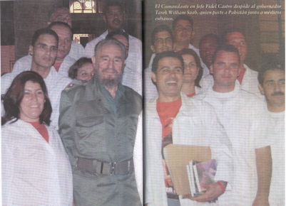 Y en medio de la penuria nos cuenta cómo “…cruzando océanos, continentes, escalas y cráteres; hasta instalar los treinta y cuatro hospitales donde nadie imaginó que otro mortal ajeno al terremoto estuviera: allí estaban ellos y ellas, con sus ritos de abnegación infinita, con la bandera de Cuba y de Fidel en el alma”.