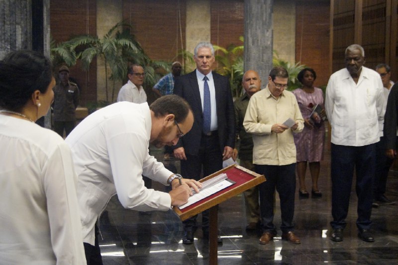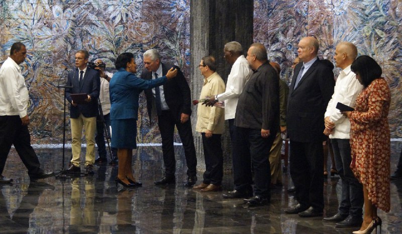 Junto a los miembros del Buró Político Esteban Lazo Hernández, presidente de la Asamblea Nacional del Poder Popular; Manuel Marrero Cruz, primer ministro, y Bruno Rodríguez Parrilla, ministro de Relaciones Exteriores, Díaz-Canel saludó a los jefes de misión y a sus familiares, tras firmar cada uno el Código de Ética, en el que se comprometen a ser fieles a Fidel, a Raúl, la Patria y la Revolución.