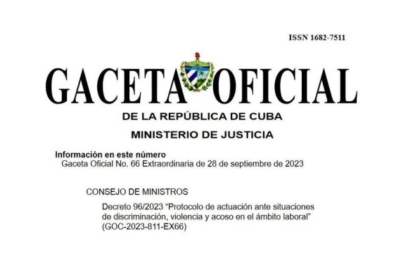 La Habana.- Este 28 de septiembre entró en vigor en Cuba el Decreto 96 "Protocolo de actuación ante situaciones de discriminación y situaciones de acoso en el ámbito laboral", que protege y aboga por un entorno laboral inclusivo y respetuoso. El decreto promueve y garantiza la igualdad de oportunidades y el respeto a la dignidad de todas las personas, previniendo y sancionando la discriminación, la violencia y el acoso en el lugar de trabajo.