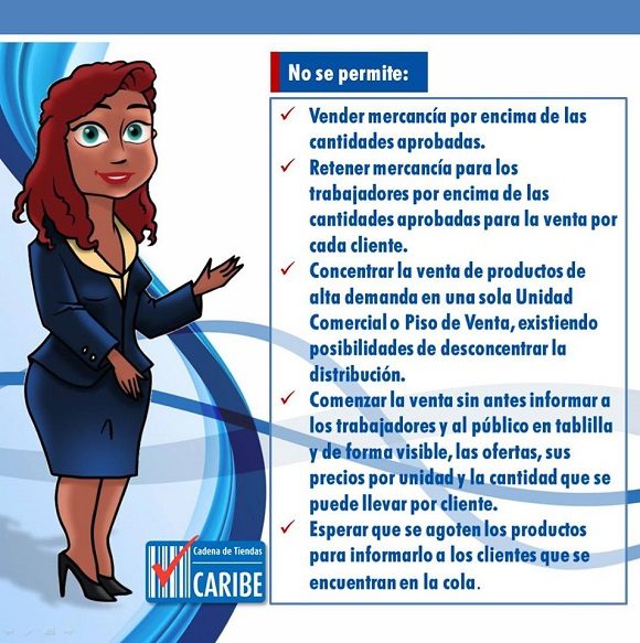 Por su parte, la cadena de Tiendas Caribe dio a conocer que en sus establecimientos está terminantemente prohibida la venta de mercancía por encima de las cantidades aprobadas o su retención para los trabajadores en número superior a lo estipulado para cada cliente.