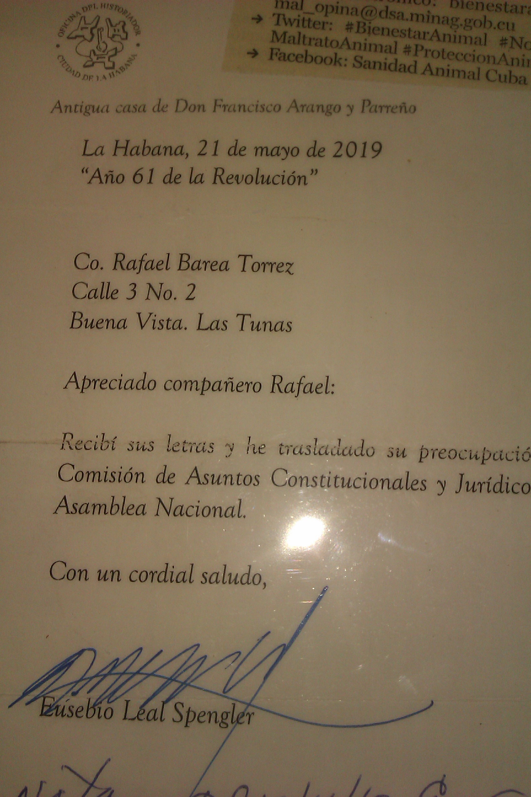 "Cuando leí en el periódico Granma, días antes de su muerte, que una comisión redacta un Decreto - Ley sobre bienestar animal, respiré tranquilo. Por eso, quise hacer pública la misiva que recibí de este patriota honesto y sacrificado. Es mi reconocimiento y respeto a su memoria. Siento que esto marca un puente entre Eusebio y yo. O mejor, que me trasciende y es el agradecimiento de los tuneros a su persona y obra".
