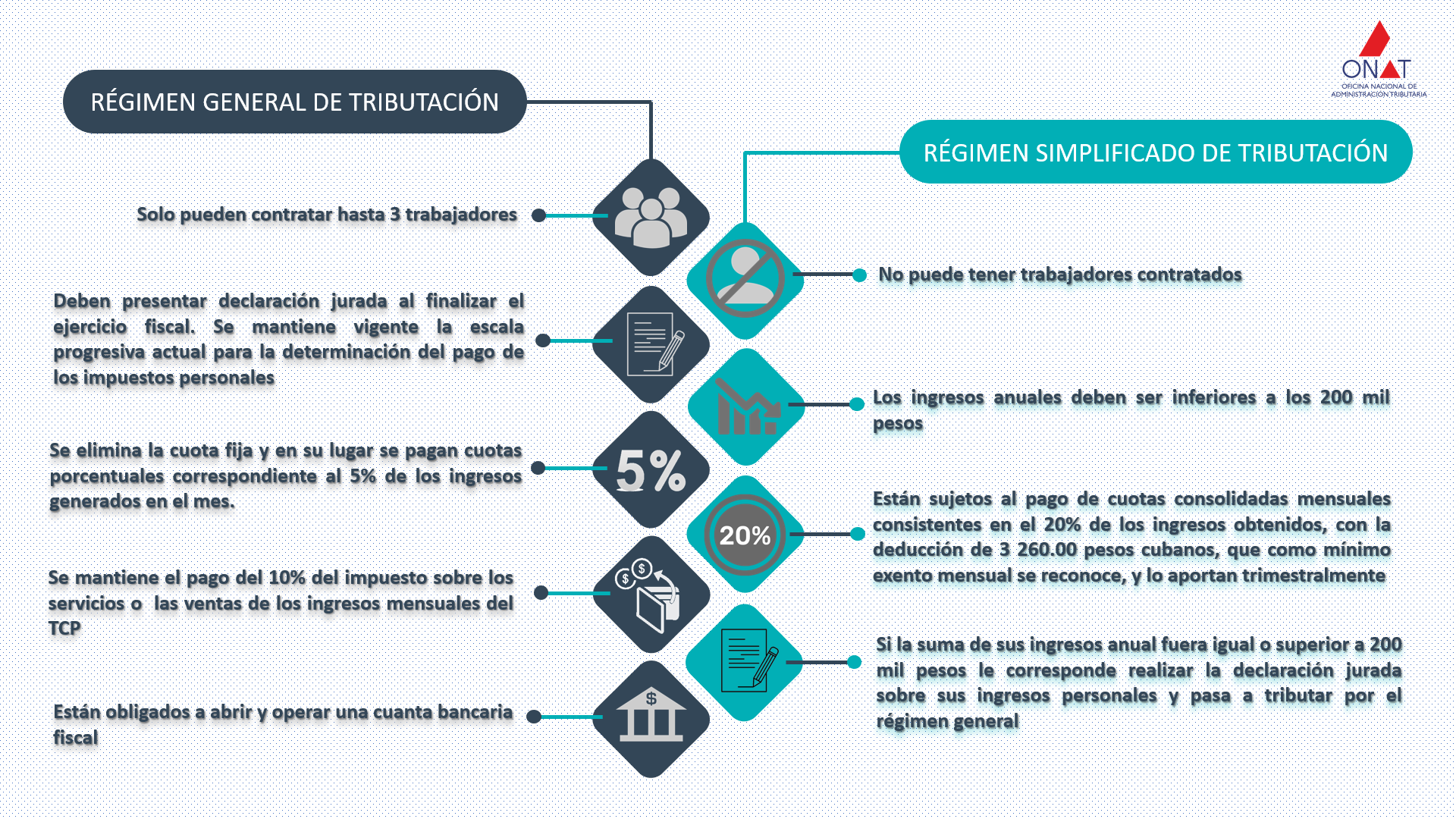 Desde el lunes pasado igualmente están vigentes otros cambios para el trabajo por cuenta propia; el más relevante: su redefinición como una labor realizada autónomamente, aunque el titular puede contratar hasta tres empleados. A la par, comprende algunas transformaciones en el sistema tributario para el sector no estatal de la economía cubana.