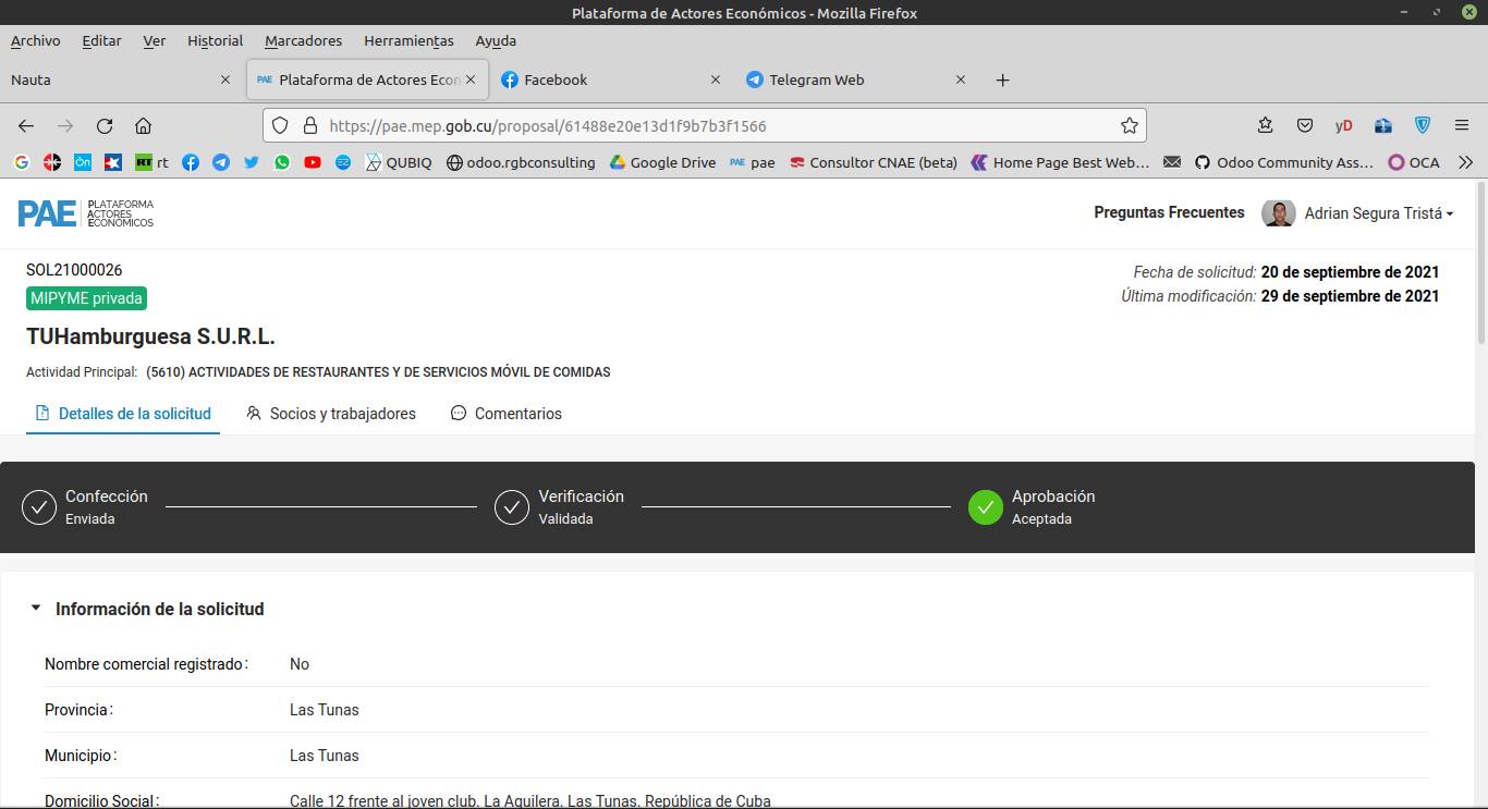 El 20 de septiembre pasado, el MEP abrió la plataforma digital en la cual los aspirantes tanto estatales como privados presentaron sus propuestas para erigirse en micro, pequeñas y medianas empresas (Mipymes), o en cooperativas no agropecuarias (CNA). En la primera convocatoria dieron luz verde a 35, que se dedicarán a la producción de alimentos, la exportación; o aquellas que son parte de proyectos de desarrollo local, de negocios incubados en parques científicos y tecnológicos, así como otros de base tecnológica, y economía circular y reciclaje. En ese primer grupo estuvo TUHamburguesa, nombre con el que figuró la solicitud presentada por este joven, egresado hace cinco años de la Universidad de las Ciencias Informáticas. De hecho, su propuesta calificó entre las cinco de la región oriental del país, la zona de la cual se aprobaron menos propuestas.