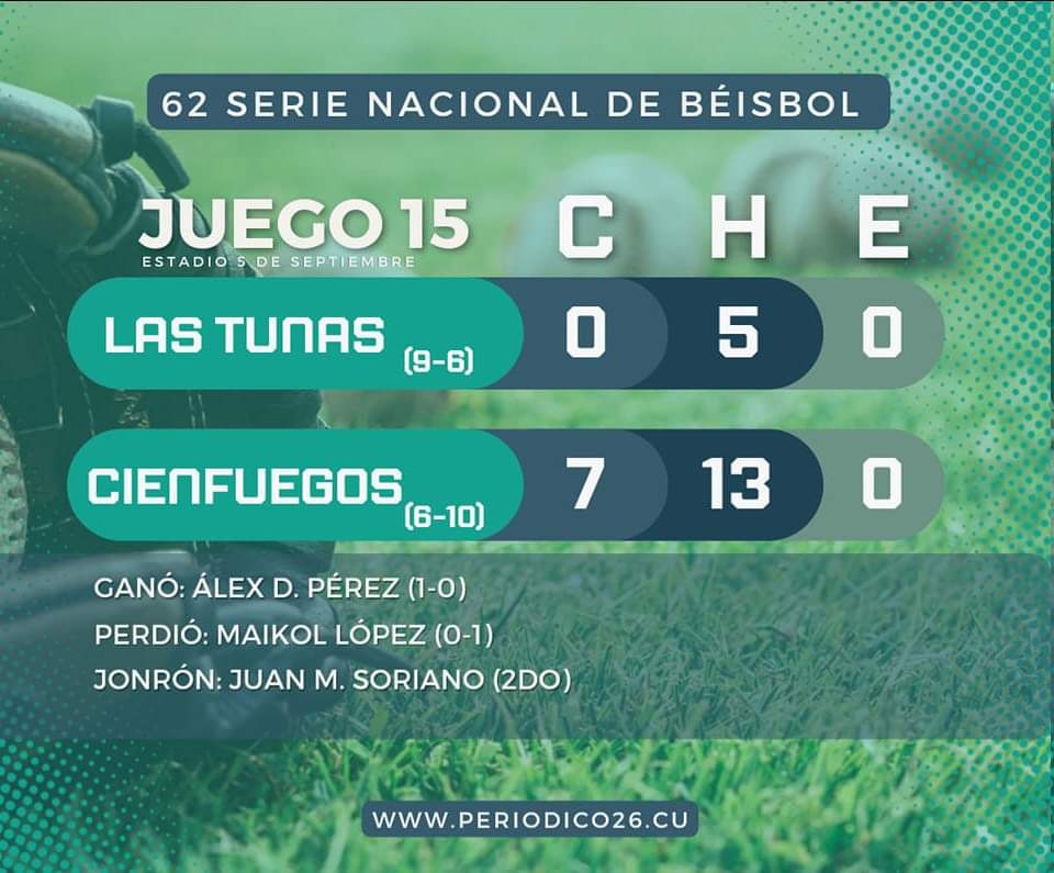 La armada de Abeysi Pantoja, con balance de nueve victorias y seis fracasos, evidenció la escapada de Pinar del Río y Sancti Spíritus en la cima del evento. En aras de refrendar la condición de temibles, si de bateo se trata, los tuneros buscarán la revancha este sábado, a partir de las 2:00 pm, en la Perla del Sur.