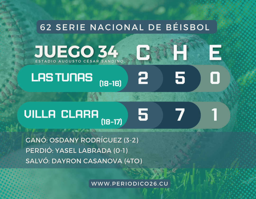 Las Tunas.- Los Azucareros de Villa Clara derrotaron este sábado 5x2 a los Leñadores de Las Tunas, en el regreso tras nueve años del torpedero Roberto Súliban Baldoquín a la Serie Nacional de Béisbol.