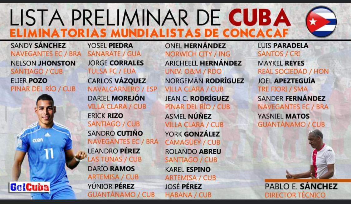 Entre los nombres anunciados hoy, sobresale el delantero Onel Hernández, del Norwich City de la segunda división en Inglaterra, quien el año anterior se convirtió en el primer cubano con participación en la Liga Premier. Además, aparecen el defensor Carlos Vázquez (Cavafe), jugador del Navalcarnero en la segunda B de España; Jorge Luis Corrales, del Tulsa FC de la USL Championship, segundo nivel de Estados Unidos; y el atacante Joel Apezteguía, del SP Tre Fiori, de San Marino.