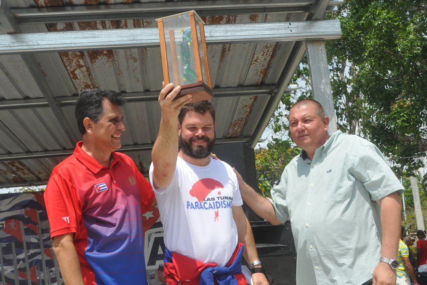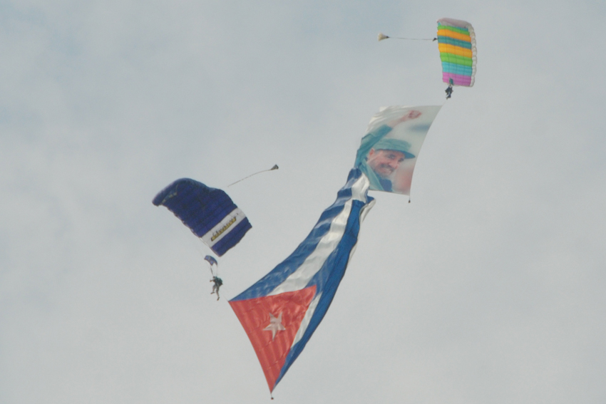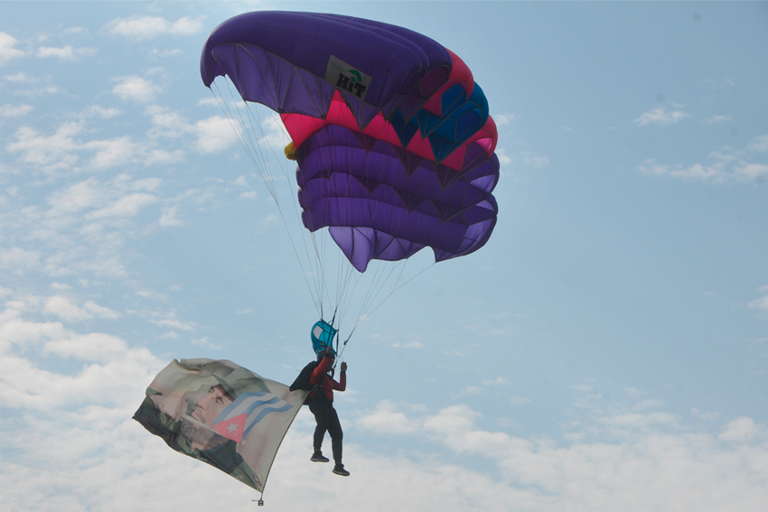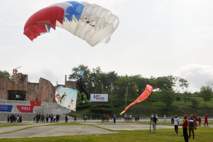 Las Tunas.- La Plaza de la Revolución Vicente García González de esta ciudad acogió hoy un salto de paracaidismo organizado por el doctor en Ciencias Fidel Antonio Castro Smirnov y titulado Salto por Fidel y los Trabajadores.