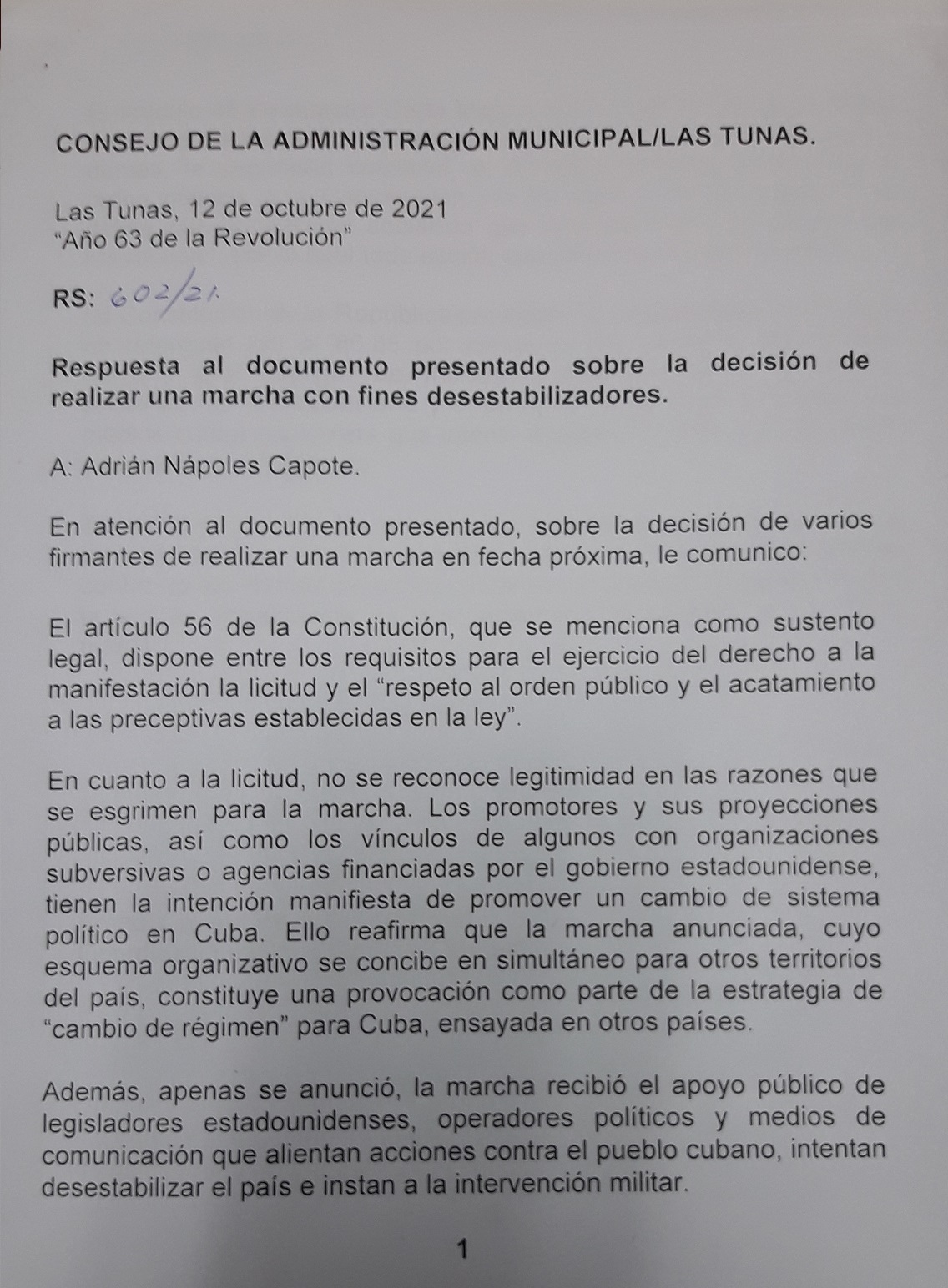 Este martes representativos de la Oficina de Atención a la Población de la Asamblea Municipal de Poder Popular en la capital de esta provincia del oriente cubano notificaron la decisión a los solicitantes, informaron a 26 Arcadis Estrada Rodríguez, coordinador de Programas y Objetivos del Consejo de la Administración Municipal de Las Tunas y Yoan Manuel Arzuaga Rodríguez, asesor jurídico del Gobierno en el territorio.
