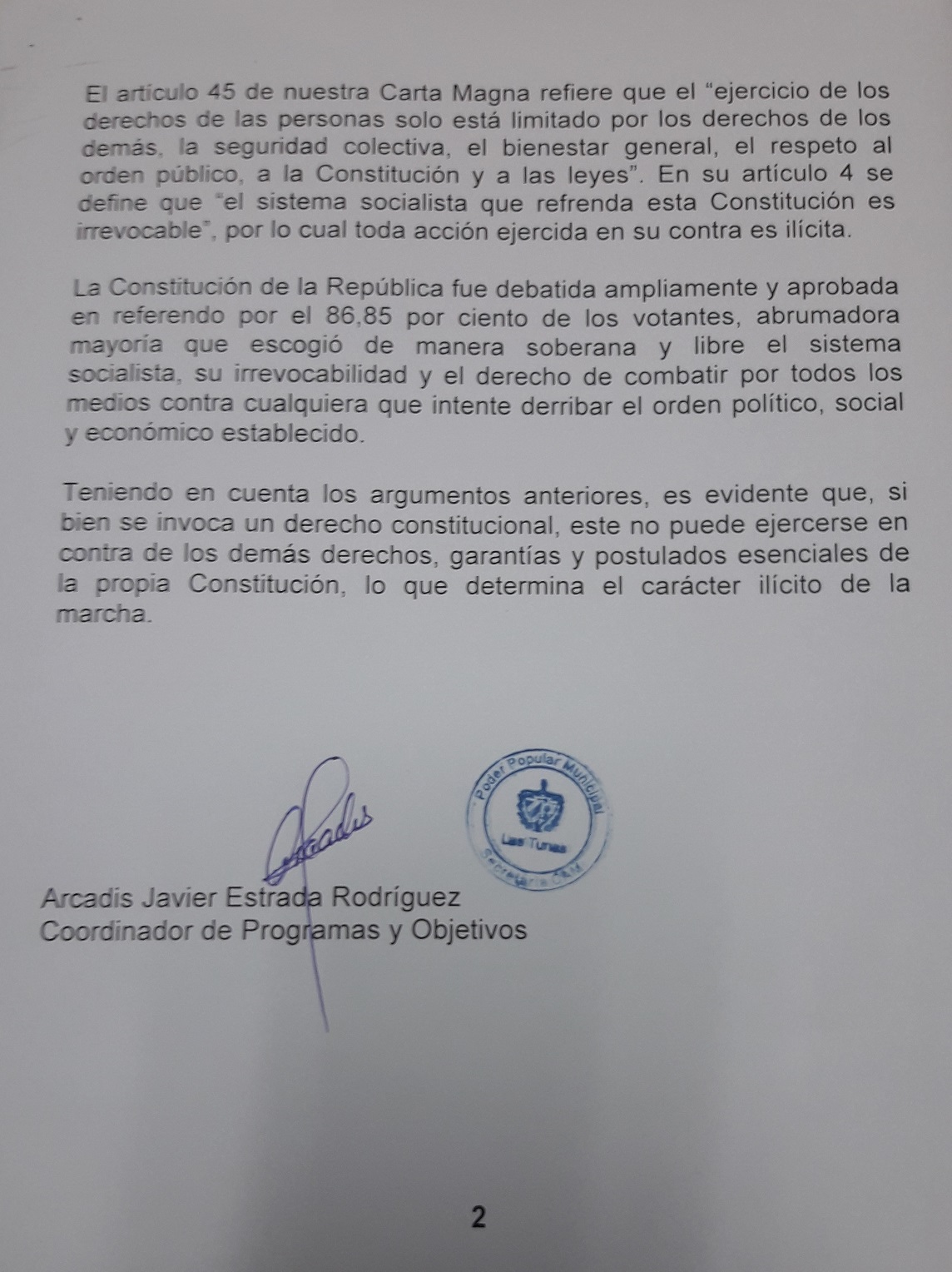 Las Tunas.- Las autoridades del Gobierno de esta provincia denegaron el permiso a una manifestación anunciada por sus promotores para noviembre próximo y que movimientos sociales y activistas revolucionarios le habían señalado sus intenciones desestabilizadoras del orden social y político refrendado por la Constitución de la República.