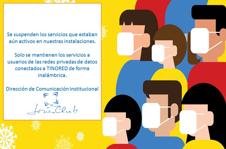 Este miércoles el Joven Club notificó el cierre temporal de sus instalaciones. Solo se mantendrán, dijo, los “servicios el acceso inalámbrico a TinoRed, red de Joven Club que posee en sus contenidos nuestros productos y en la cual más de 18 mil usuarios acceden a ella desde sus casas”.