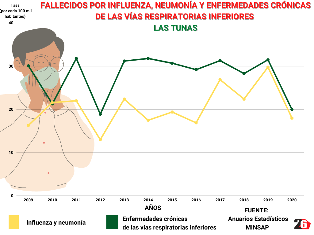 Según los anuarios estadísticos del Ministerio de Salud Pública, la influenza y la neumonía fueron la quinta causa de muerte entre los tuneros durante el año 2020 y así lo ha sido por lo menos en la última década; solo superada por las enfermedades del corazón, los tumores malignos, las dolencias cerebrovasculares y los accidentes, por ese orden. Mientras, en un sexto lugar se ubican los padecimientos crónicos de las vías respiratorias inferiores.