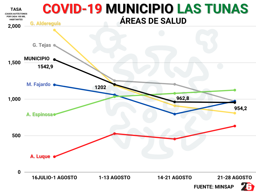 El municipio de Las Tunas sigue siendo el epicentro de la pandemia en esta provincia del oriente cubano. Tras la aplicación de las medidas, su tasa global de casos autóctonos por cada 100 mil habitantes continuó bajando, lo cual indicaría la efectividad de las acciones. Eso sería válido, incluso, para áreas de Salud densamente pobladas como la “Gustavo Aldereguía”, que redujo significativamente su tasa; no así para otras con un gran número de habitantes como la "Piti Fajardo". Más preocupante es el escenario en la “Aquiles Espinosa”, cuya tasa creció con respecto al comienzo de mes.
