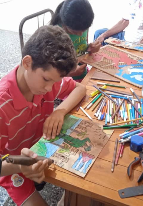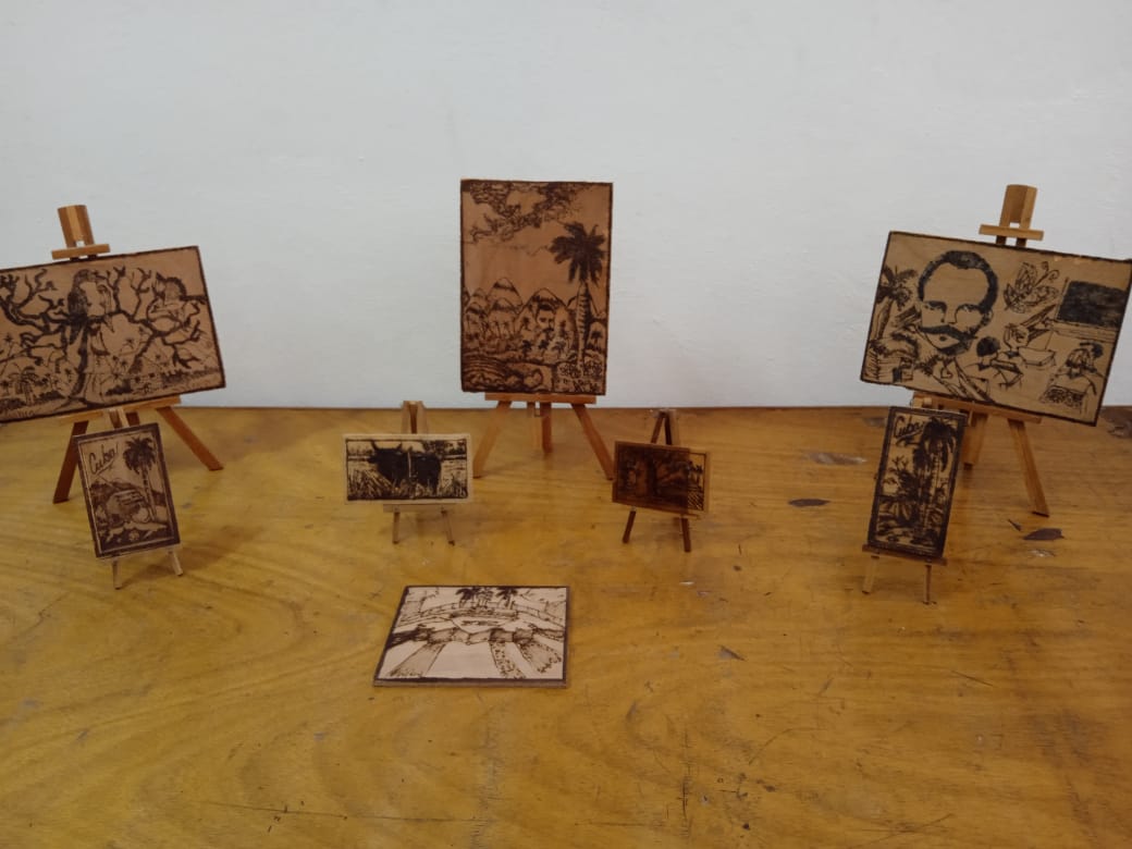 "Estoy muy agradecido con Ana Margarita Arada Clavería, presidenta de la vanguardia artística juvenil aquí, quien me propuso la idea de este taller. Ha sido hermoso. Se desarrolló los jueves y, sábados de julio y agosto, con buena acogida. Los infantes asistieron primeramente atraídos por la máquina de pirograbado que, como funciona con electricidad, amerita de cuidado para no quemarse. Eso y más les enseñé. Por eso trabajo con niños no tan pequeños".