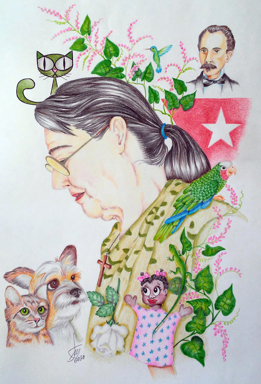 Siempre estuve claro de que quería incluir a un niño (a) y a un adulto mayor. Pintando los accesorios de una pequeña en el pelo, le incluí a Vinagrito y entonces supe que a Teresita debía realizarle el otro retrato. Guiándome por el que le hice para el libro publicado en La Habana (que le gustaba mucho), cumplí mi cometido y me embullé a ilustrar sus canciones, pero con otros matices.
