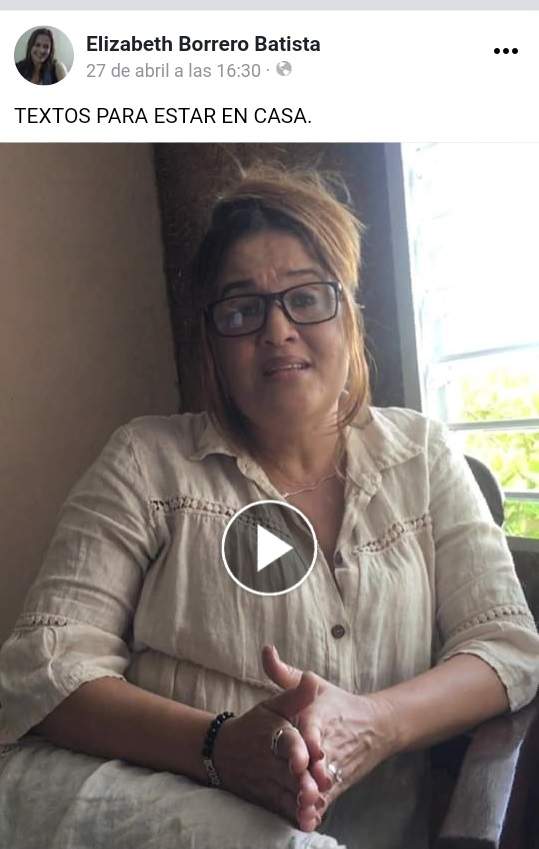 “Tenemos que aprender a reír con llanto y también a llorar con carcajadas”, dice en uno de sus videos caseros la actriz Elizabeth Borrero. Se trata de la pieza Reír llorando, del poeta mexicano Juan de Dios Peza. La interpretación conmueve, te hace pensar en las circunstancias actuales y la complejidad del ser humano. A pesar de que ella ha compartido varias obras durante la cuarentena a través de Facebook y YouTube, y de hacerlo con el carisma y la profesionalidad que la caracterizan, no cree que ha hecho nada del otro mundo.