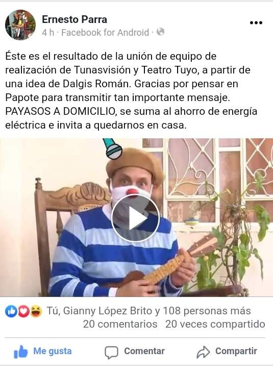 Albita ha subido además pequeños videos de presentaciones de libro, fotos de actuaciones, poemas de su autoría y otras iniciativas para deleite del público. Mientras tanto, Ernesto Parra, líder de Teatro Tuyo, continúa con su popular dinámica Payasos a domicilio, y hasta se ha unido a un equipo del telecentro TunasVisión en el cuerpo de Papote (su personaje insigne) para transmitir a la audiencia la necesidad de ahorrar energía eléctrica.