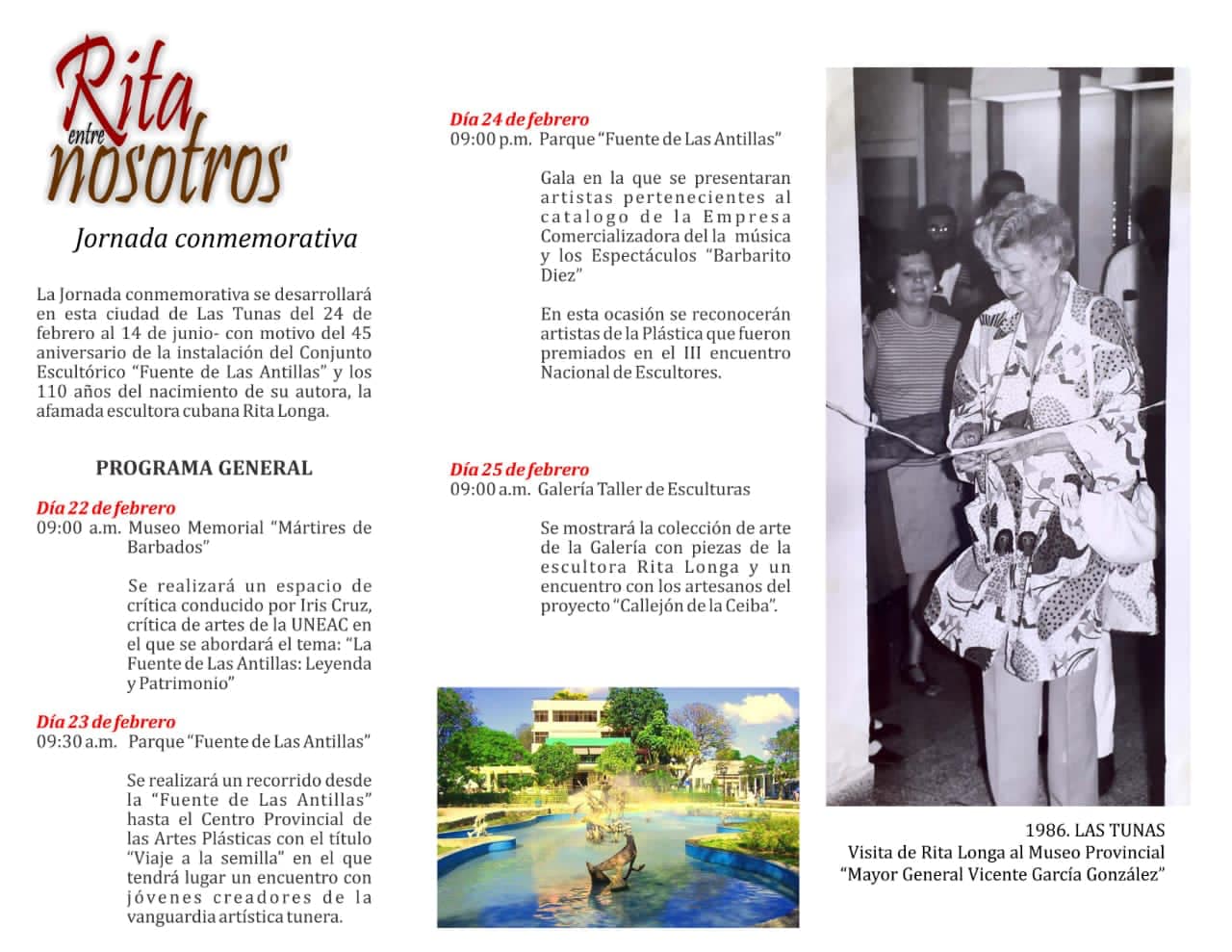 Las Tunas.- Desde hace varios días, en las redes sociales se anuncia la jornada de celebración por el aniversario 45 de la inauguración de la Fuente de las Antillas y el 110 del natalicio de su autora, la entrañable Rita Longa Aróstegui.