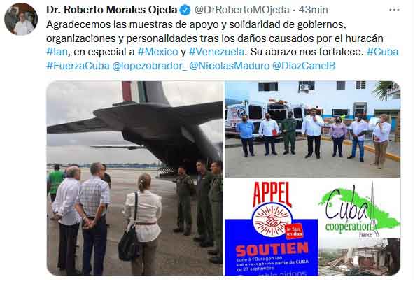 En su cuenta de Twitter, el funcionario destacó el apoyo de México y Venezuela con material eléctrico destinado a la recuperación de la provincia de Pinar del Río, el territorio más afectado por el evento meteorológico. "Su abrazo nos fortalece", expresó.