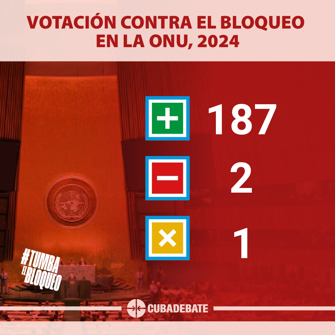 La resolución presentada por Cuba en esta jornada para pedir el fin del bloqueo económico, comercial y financiero impuesto por Estados Unidos fue aprobada de manera contundente por la Asamblea General, con 187 votos a favor.