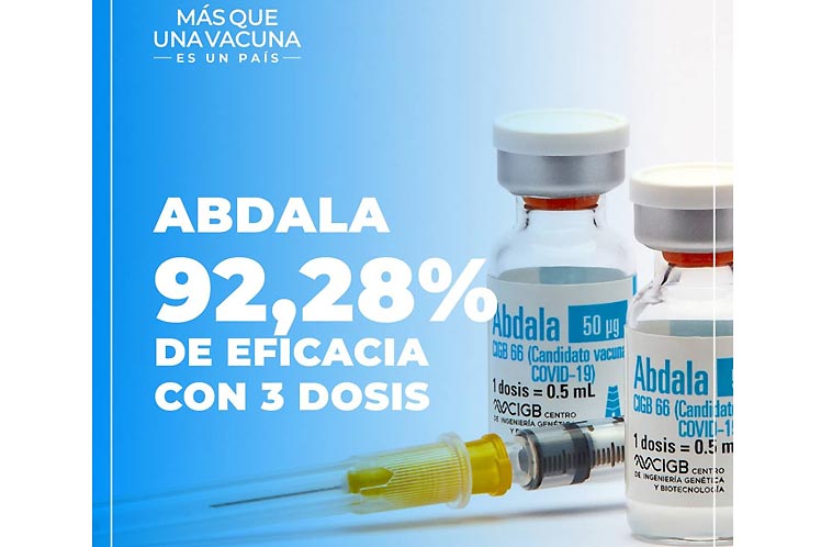 "Abdala, candidato vacunal del Centro de Ingeniería Genética y Biotecnología, muestra una eficacia del 92,28 por ciento, en su esquema de tres dosis", publicó en Twitter el Grupo Empresarial de las Industrias Biotecnológica y Farmacéutica de la isla (BioCubaFarma).
