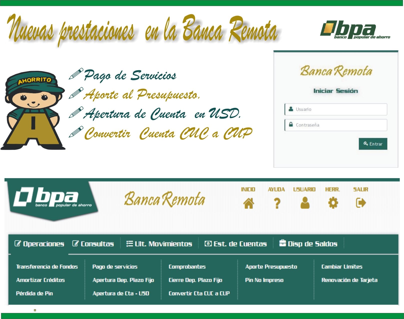 Las Tunas.- El Banco Popular de Ahorro (BPA) agregó nuevas opciones a su plataforma de banca remota a través de la cual se podrán pagar nuevos servicios, convertir cuentas en pesos convertibles (CUC) a pesos cubanos y solicitar tarjetas asociadas a cuentas en dólares estadounidenses (USD).