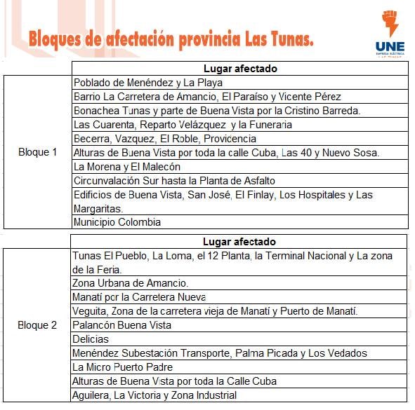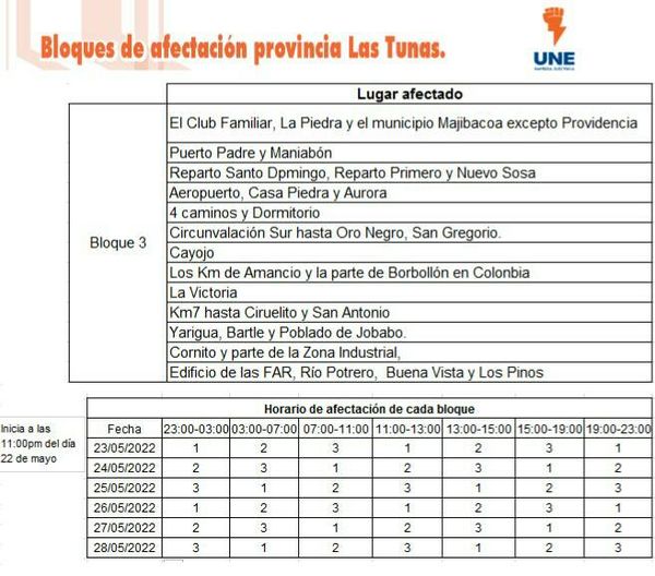 El fin de semana pasado, la Empresa Eléctrica de Las Tunas anunció que el déficit de generación en el Sistema Electroenergético Nacional sobrepasó la potencia a partir de la cual se había organizado la provincia en cinco bloques diferentes. Por lo cual, añadió, fue necesario establecer tres que posibilitaran, por un lado, no sobrepasar las cuatro horas continuas de afectación; aun cuando en el trascurso de la jornada un mismo bloque fuera afectado en más de una ocasión; y por otro, proteger en lo posible los horarios de desayuno, almuerzo y comida para que la ciudadanía realice acciones claves dentro de la dinámica cotidiana de los hogares como la cocción de los alimentos.