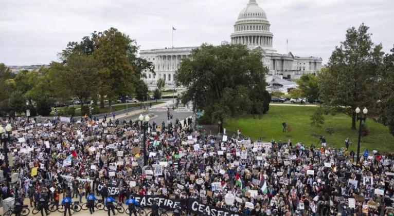 La organización "If not now" había convocado a la gente bajo el lema “Los judíos dicen 'Alto el fuego en Gaza' ahora" y eligió el Capitolio, que alberga el Senado y la Cámara de Representantes de Estados Unidos, para que los legisladores oyeran "alto y claro" ese reclamo, según indica en X.
