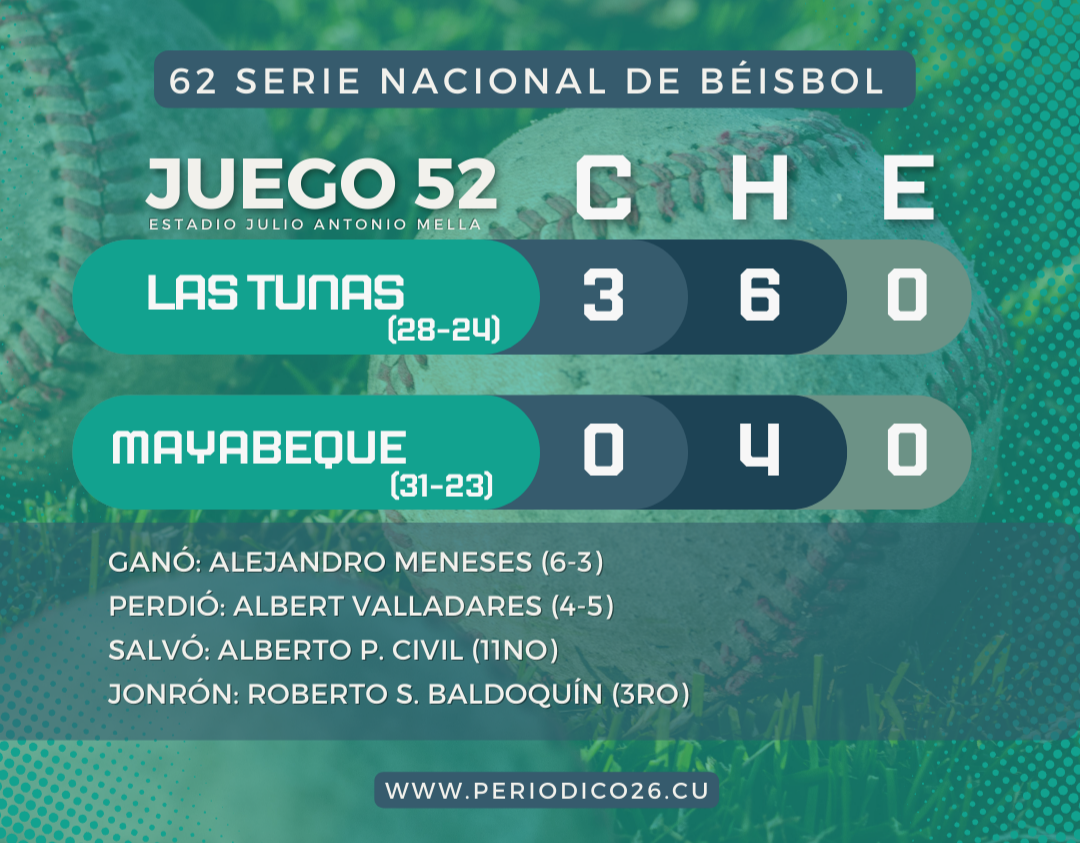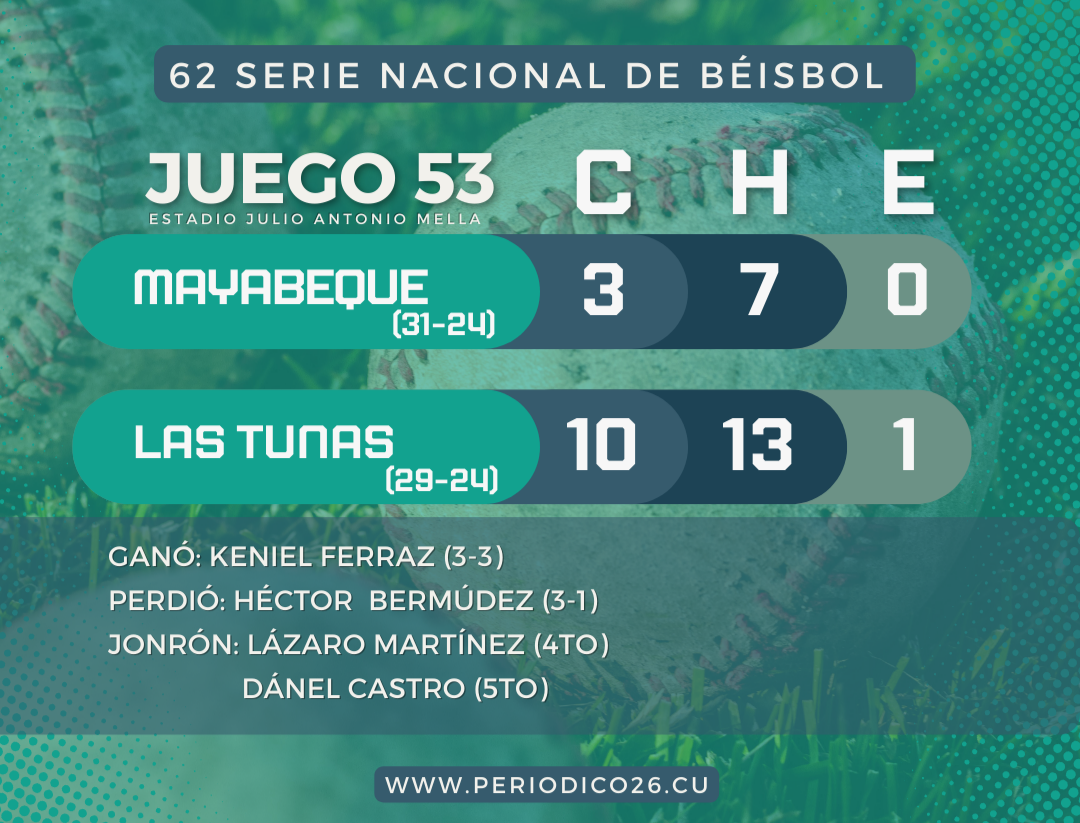 Ahora con balance de 29-24, los dirigidos por Abeysi Pantoja llegaron a cinco victorias consecutivas y, si bien se mantuvieron en el quinto puesto del campeonato, recortaron a solo media raya la distancia con el tercer lugar y a 2.5 con el nuevo puntero, Santiago de Cuba (33-23).