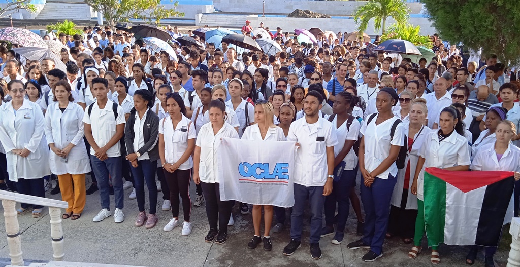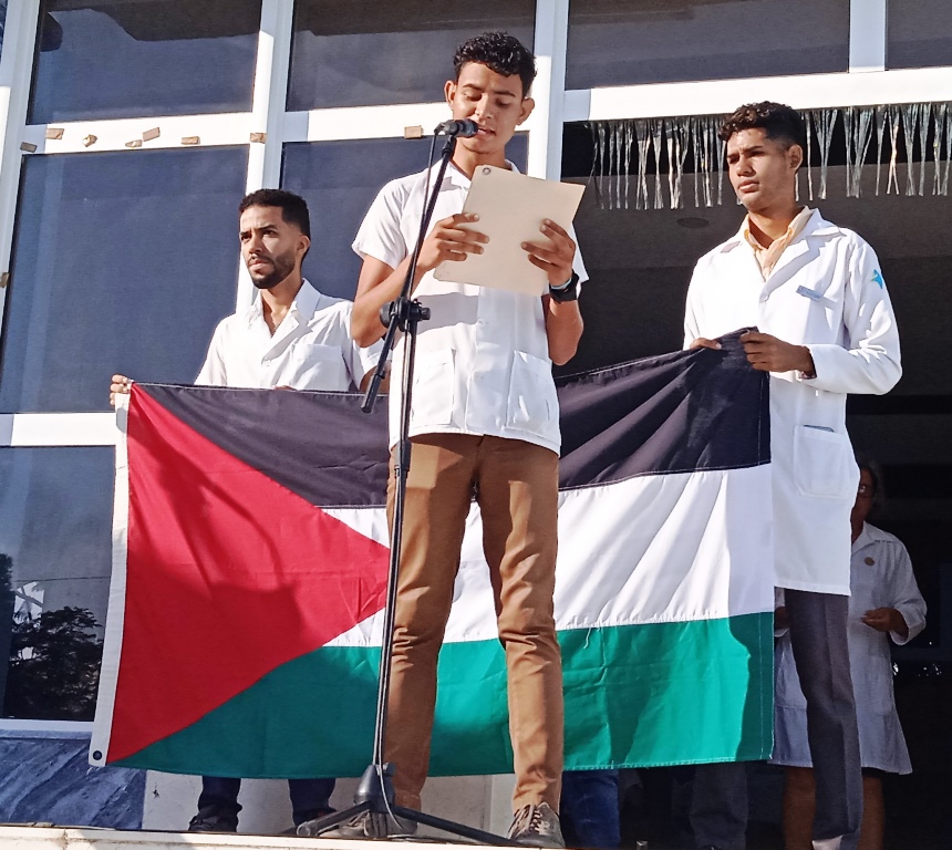 Las Tunas.- Esta mañana, la comunidad de la Universidad de Ciencias Médicas (UCM) de Las Tunas hizo un alto en los estudios y acudió a la escalinata para alzar voces y brazos solidarios con Palestina y exigir el cese del genocidio de Israel contra ese hermano pueblo.