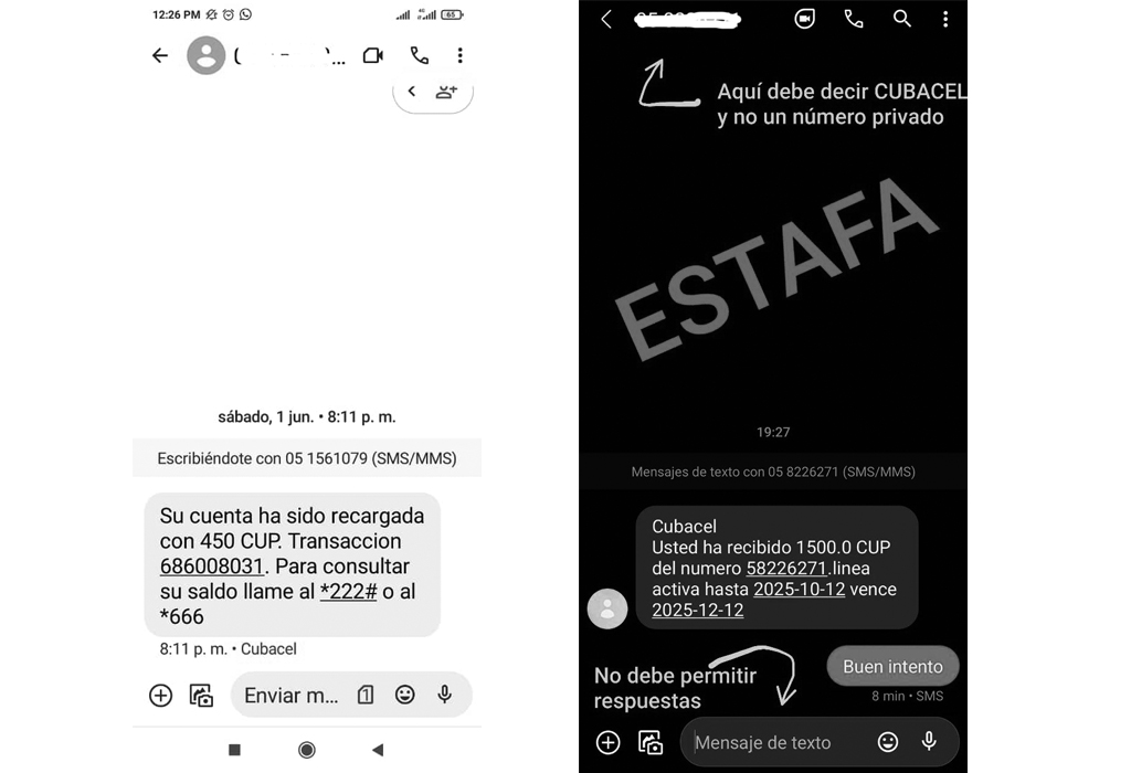 Las Tunas.- "¿Has recibido alguna vez un SMS de una supuesta recarga o transferencia y luego alguien te llama explicándote que se equivocó al transferir el saldo y que le devuelvas el dinero?"; así le preguntamos a nuestra audiencia. "A mi mamá quisieron estafarla; le mandaron un SMS diciendo que se habían equivocado, que habían pasado 500.00 pesos (…); deben tener cuidado con este tipo de personas", comentó uno de nuestros lectores. "A mi hija intentaron estafarla así, incluso dijeron que estaban en el hospital y que era una necesidad imperiosa que le devolvieran aunque fuera 100.00 pesos", relató otro de nuestros seguidores. "Pero, aclaró, primero verifiqué saldo y obviamente no habían transferido nada y luego vi que no era Etecsa quien había enviado el mensaje. Y me di cuenta de que era una estafa de las tantas".